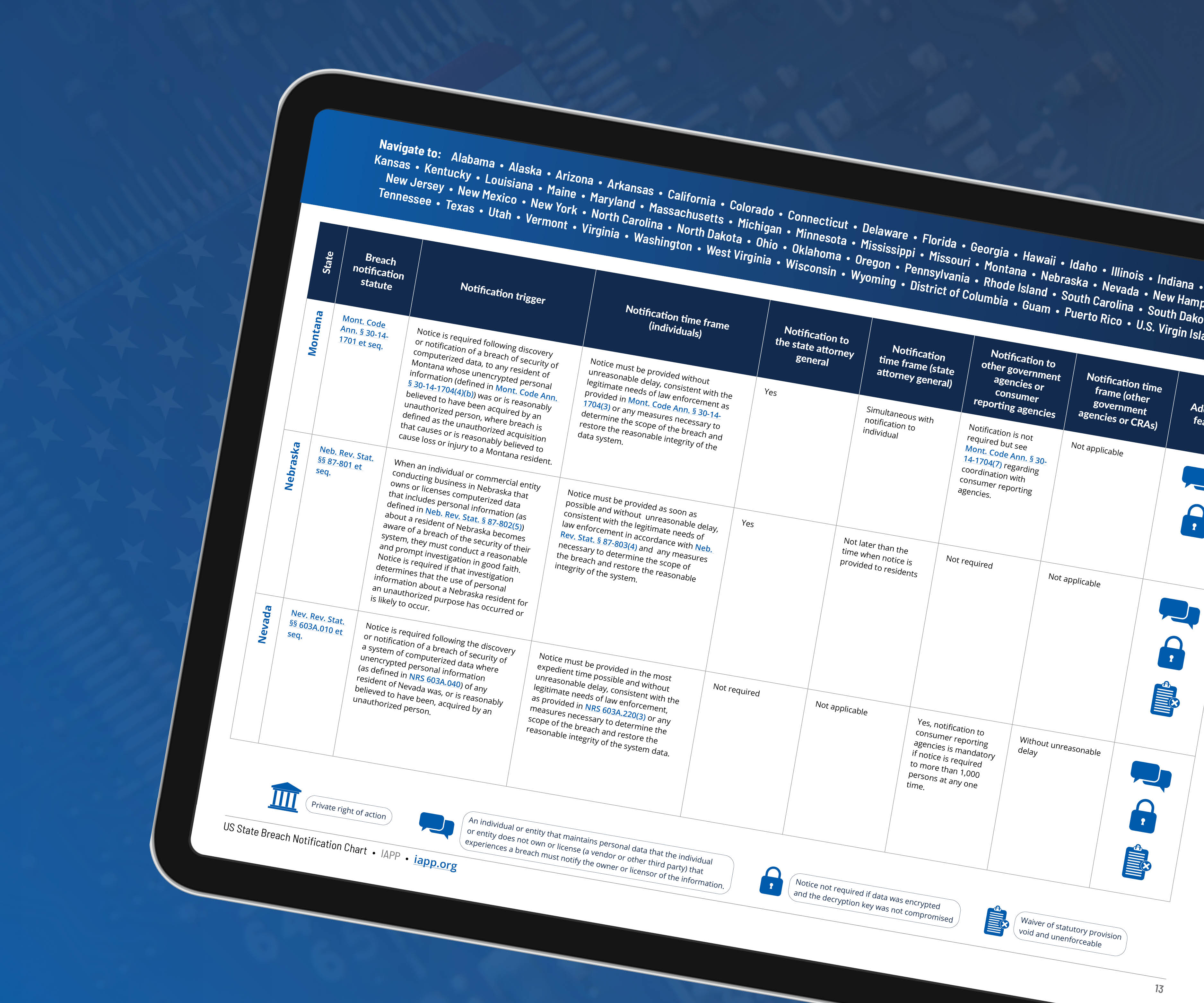 This chart provides information on US state and territory data breach notification laws.