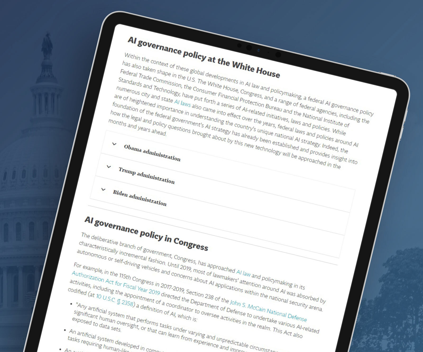 This resource provides a breakdown of artificial intelligence governance at the federal level, including the White House, Congress and federal agencies.